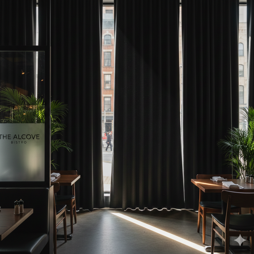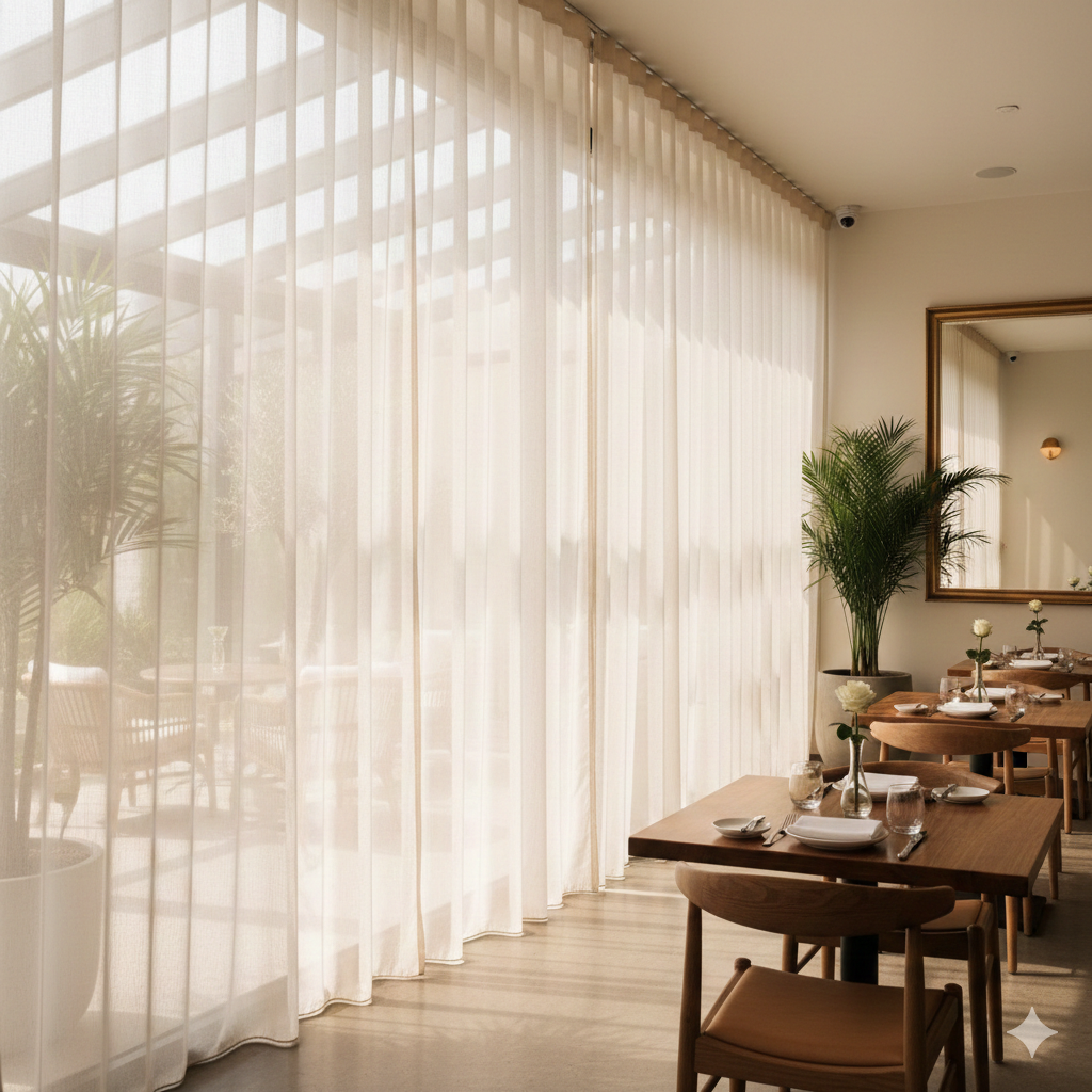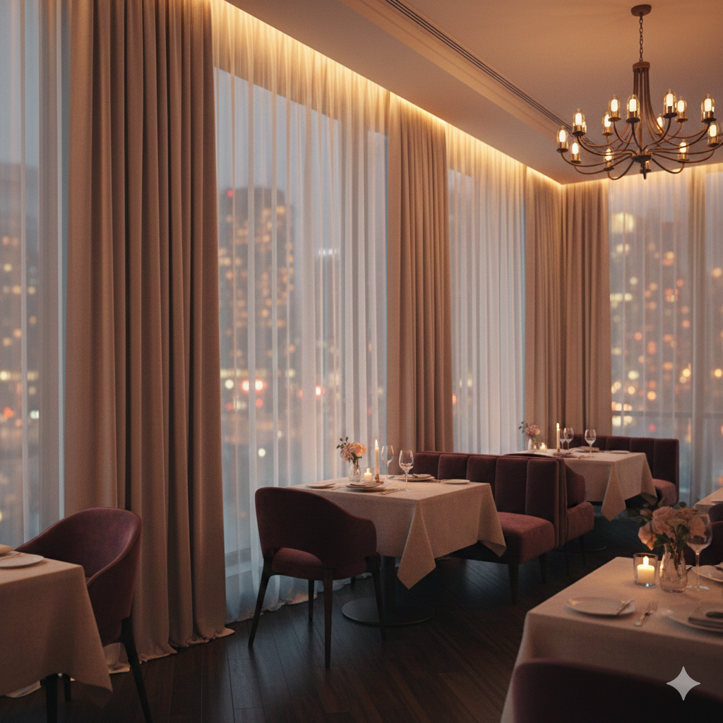 Each restaurant curtain is measured with precision and expertly installed to achieve a flawless finish. Our meticulous process ensures smooth operation, long-lasting durability, and refined elegance. Designed to withstand daily use, these curtains bring both practicality and style, perfectly complementing the atmosphere of restaurant interiors.